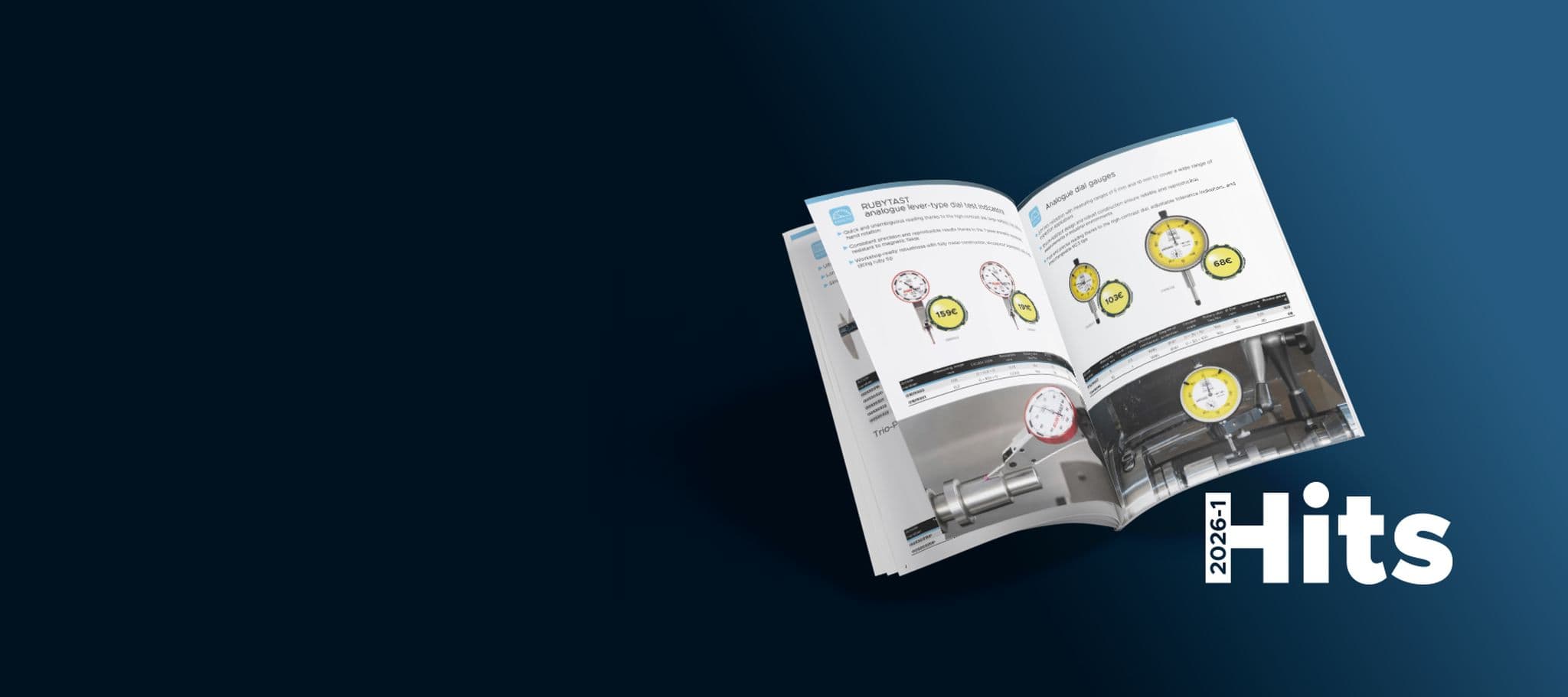 Two men in a workshop reading a catalog titled "Smart Instrument Solutions." Machinery and industrial equipment in the background.